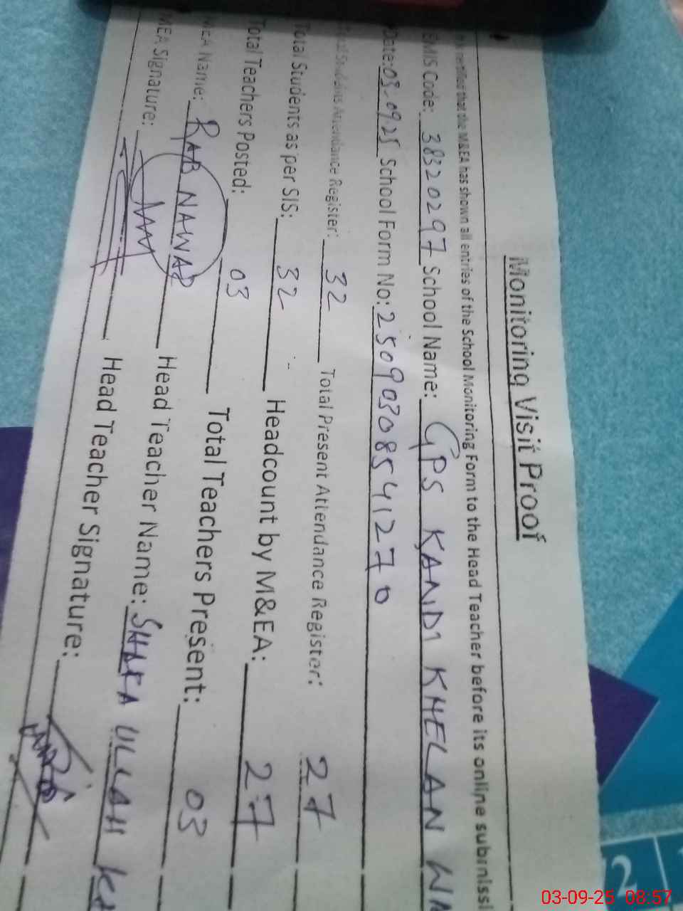| Attendance Register | Head Teacher | MEA with School | Visit Proof |