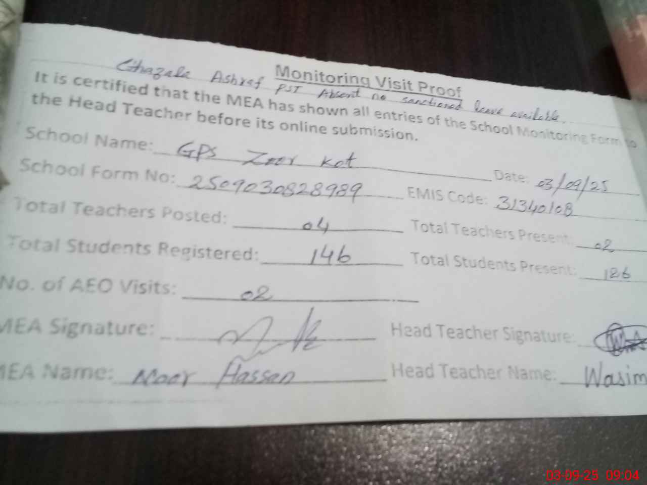 | EMIS Code: 31340108 | Name of School: GPS ZOOR KOT | |||