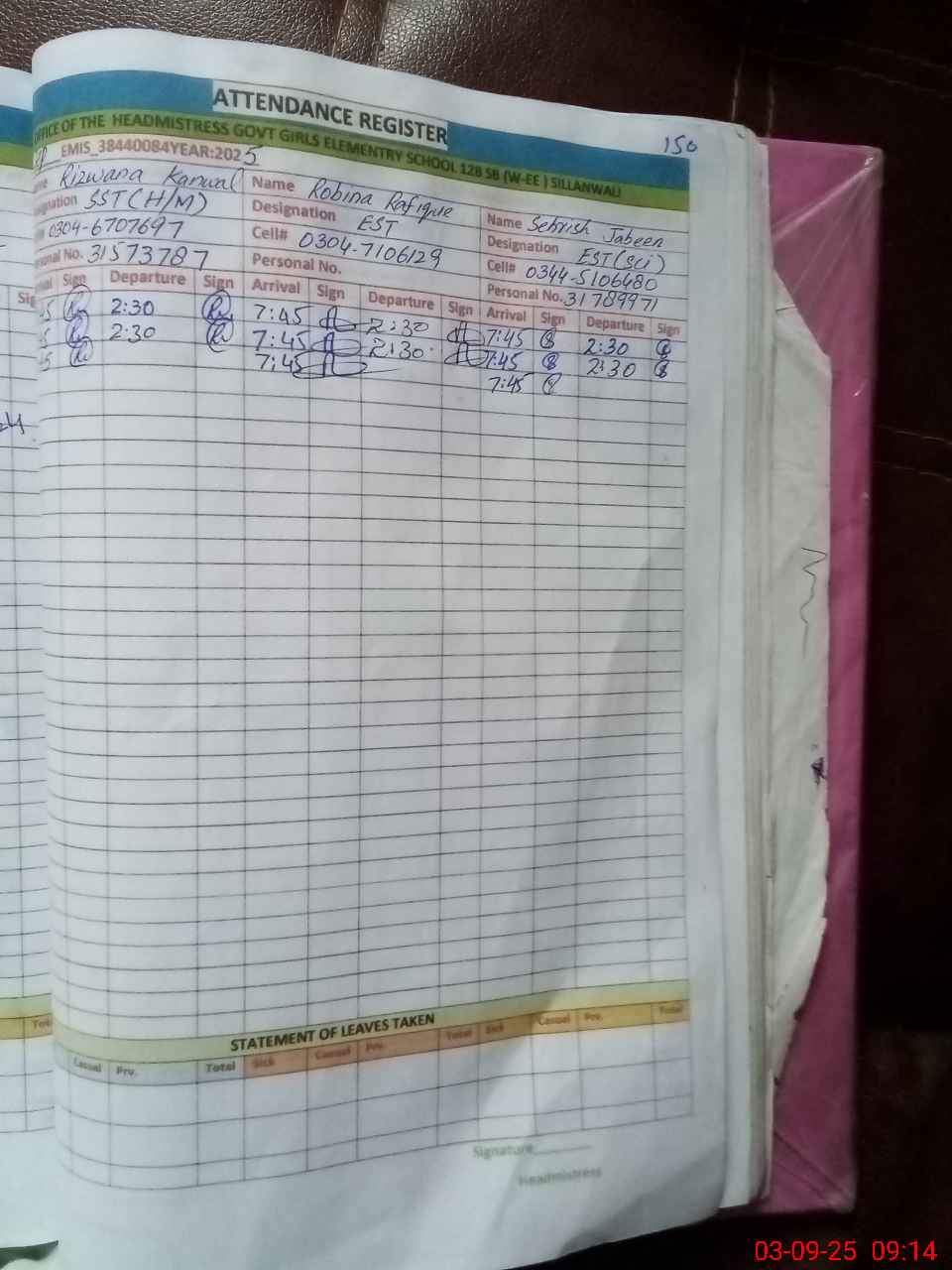 | Name: Se**** Ja**** Designation: (School Headmaster's/Headmistress's) EST SCI Phone/Cell Number: 03**** |