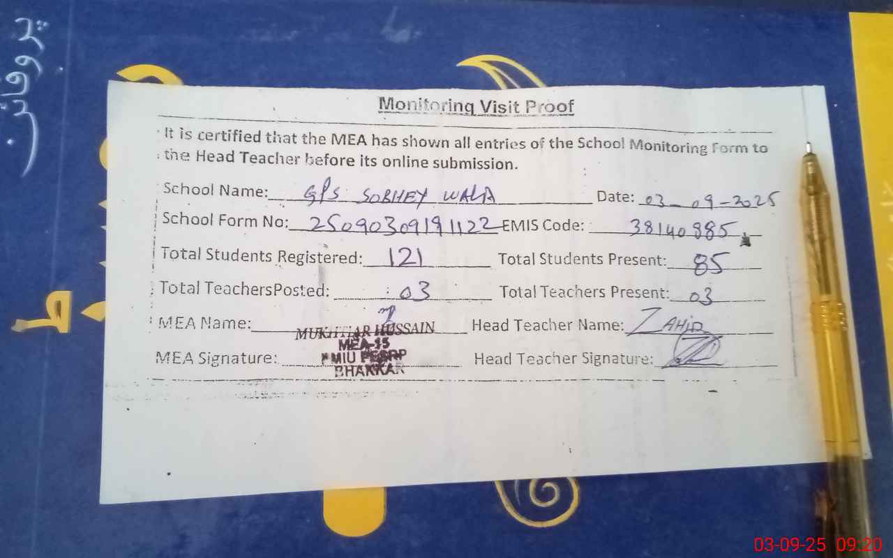 | EMIS Code: 38140885 | Name of School: GPS SOBHEY WALA | |||