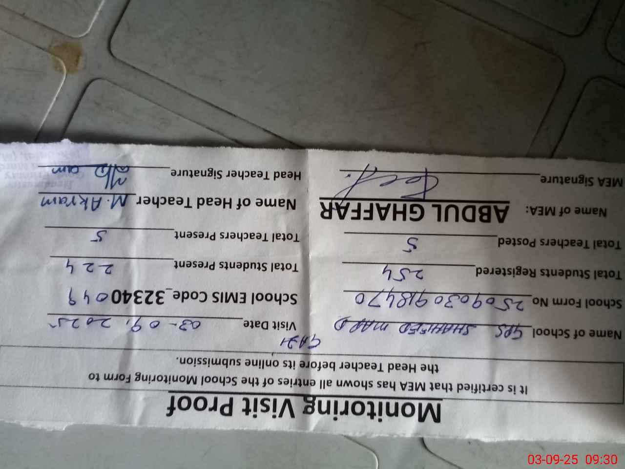 | Attendance Register | Head Teacher | MEA with School | Visit Proof |