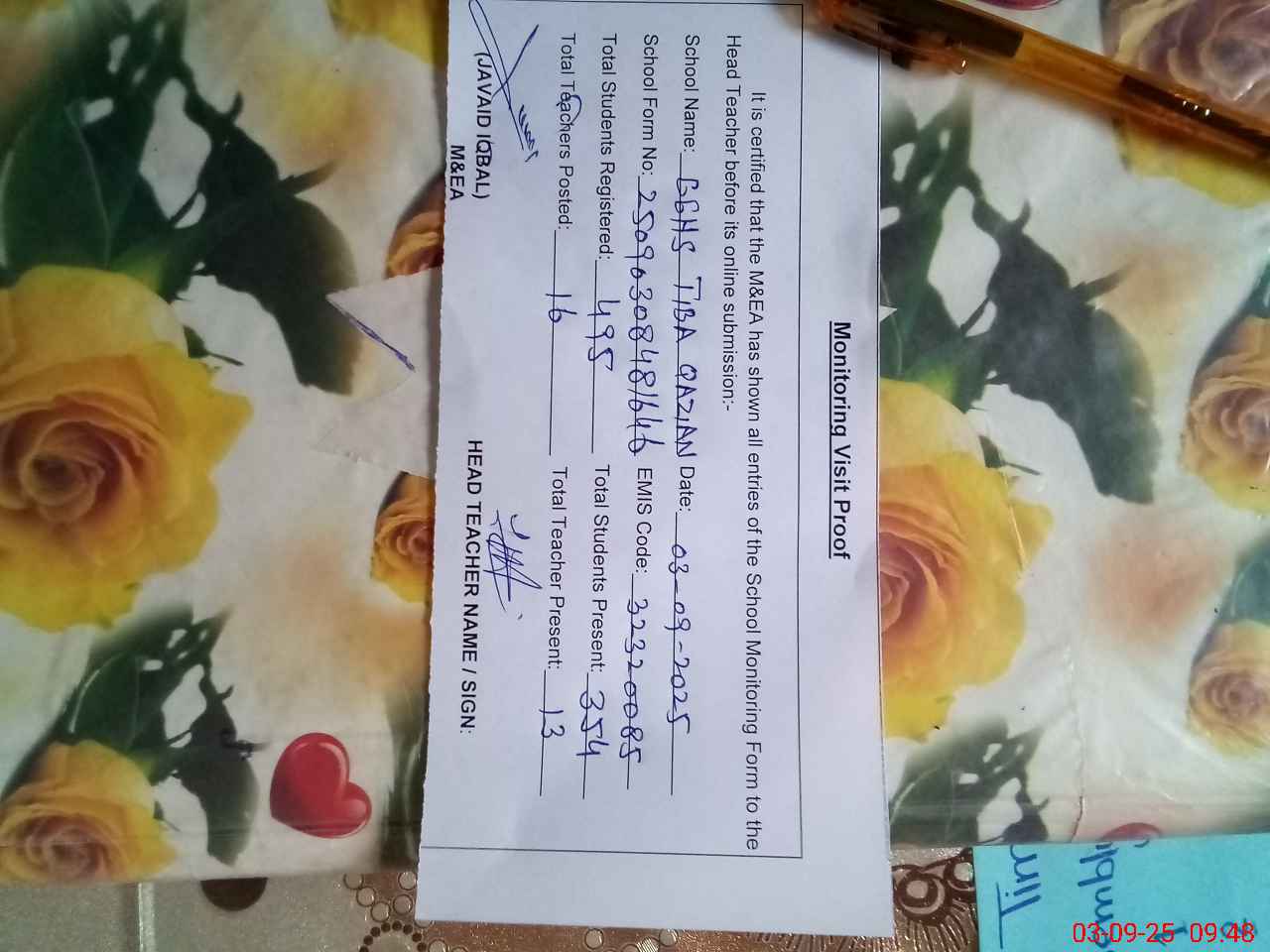 | Attendance Register | Head Teacher | MEA with School | Visit Proof |