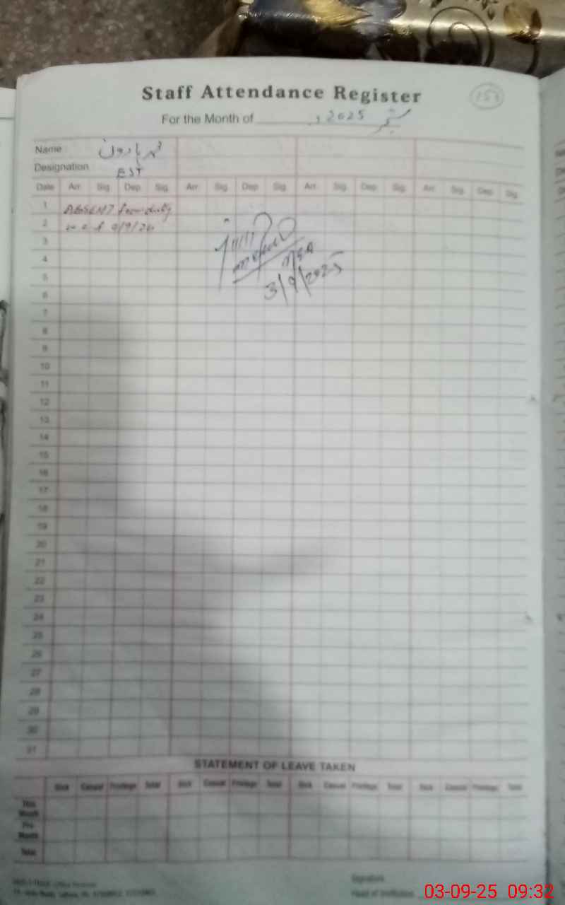 | Remarks (Use Separate Page if Required): MUHAMMAD HAROON EST IS ABSENT FROM SCHOOL WEF 09 SEP 2024 THE OFFICIAL RECORD REGARDING ACTION TAKEN AGAINST THE SAID TEACHER IS NOT AVAILABLE IN SCHOOL | |||||