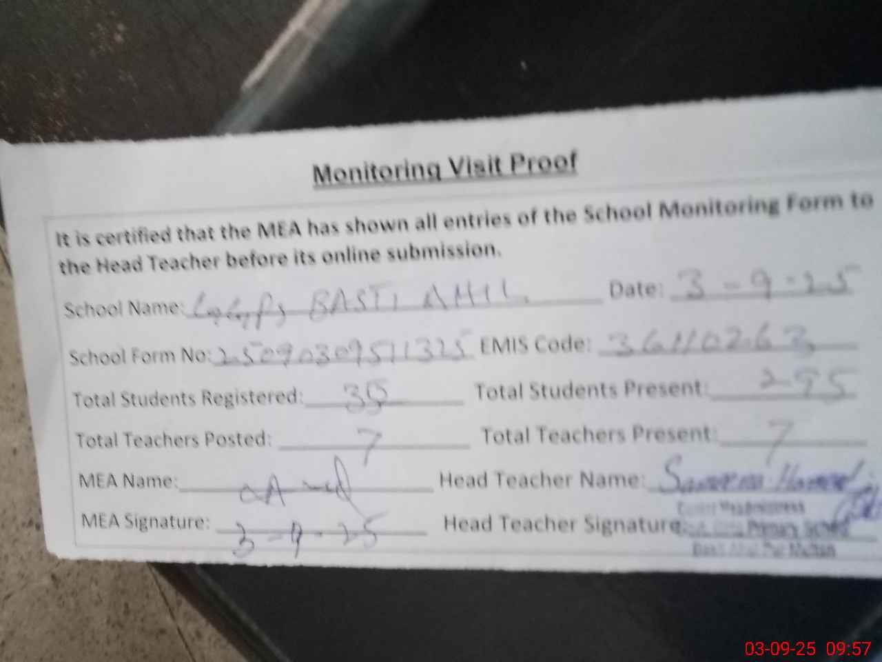 | Attendance Register | Head Teacher | MEA with School | Visit Proof |