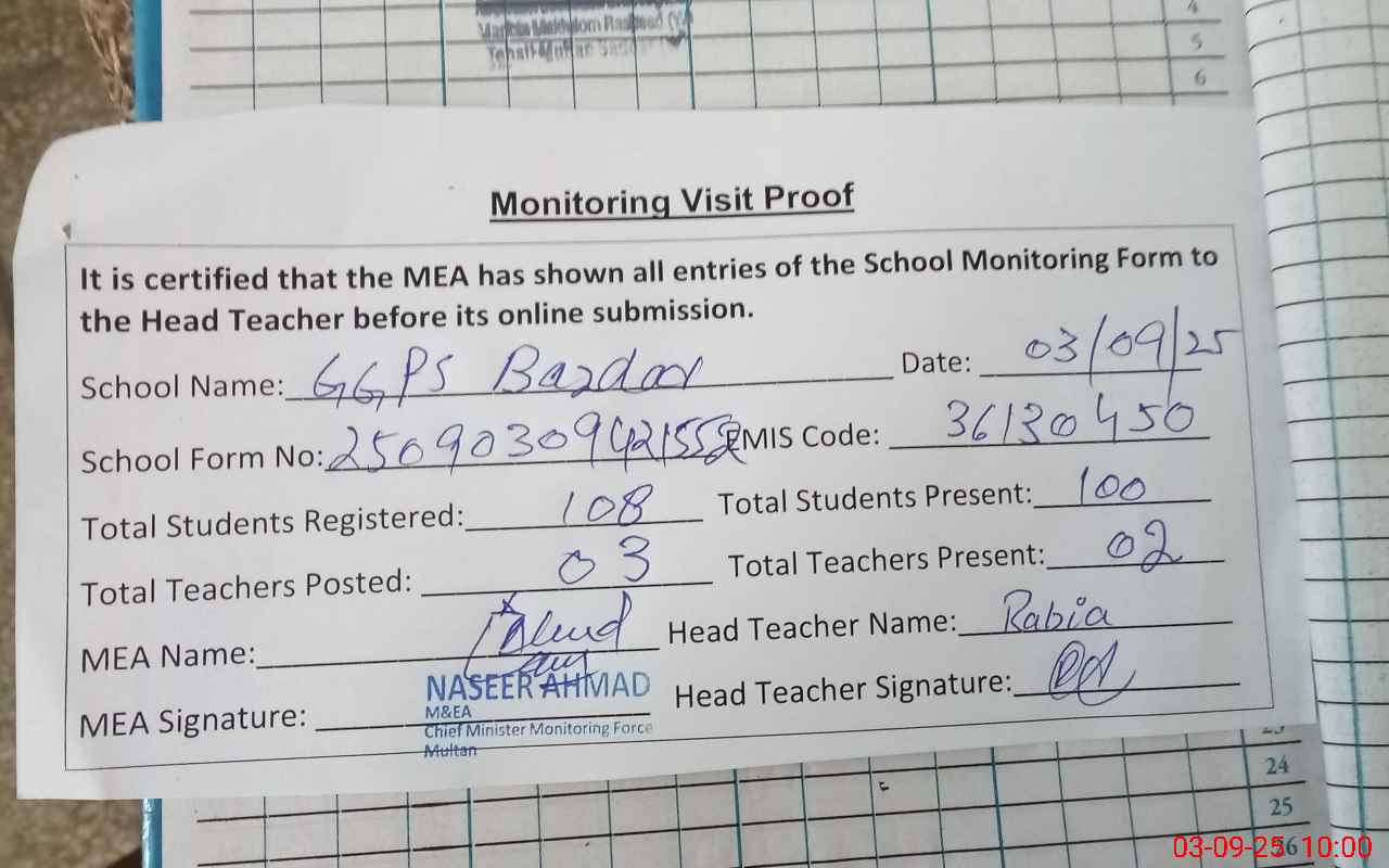 | EMIS Code: 36130450 | Name of School: GGPS BAZDAR WALA MULTAN | |||