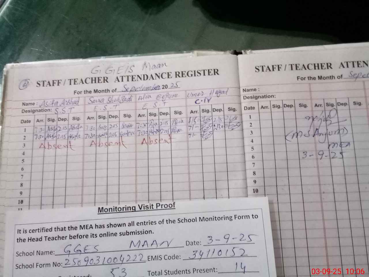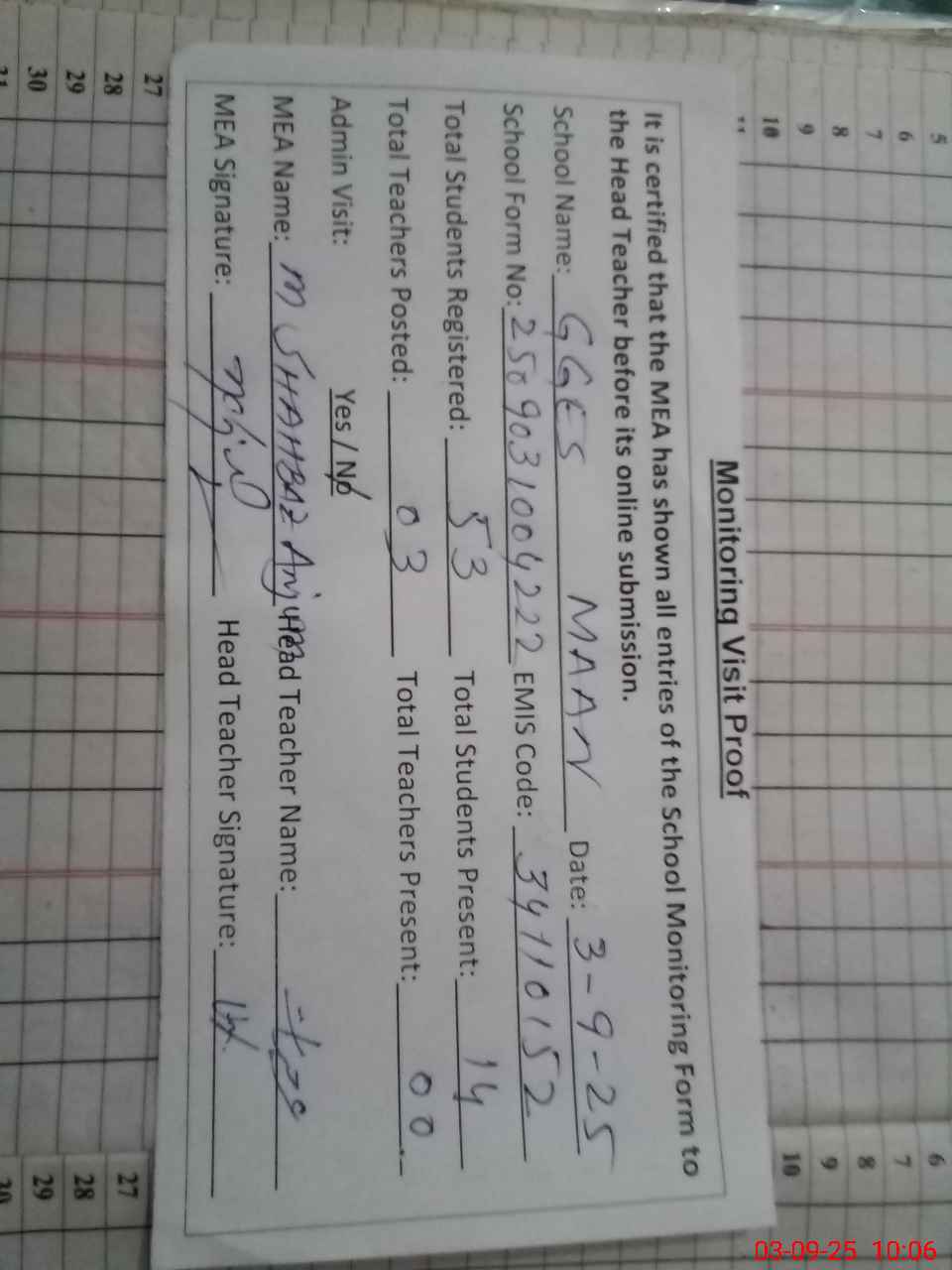 | Attendance Register | Head Teacher | MEA with School | Visit Proof |