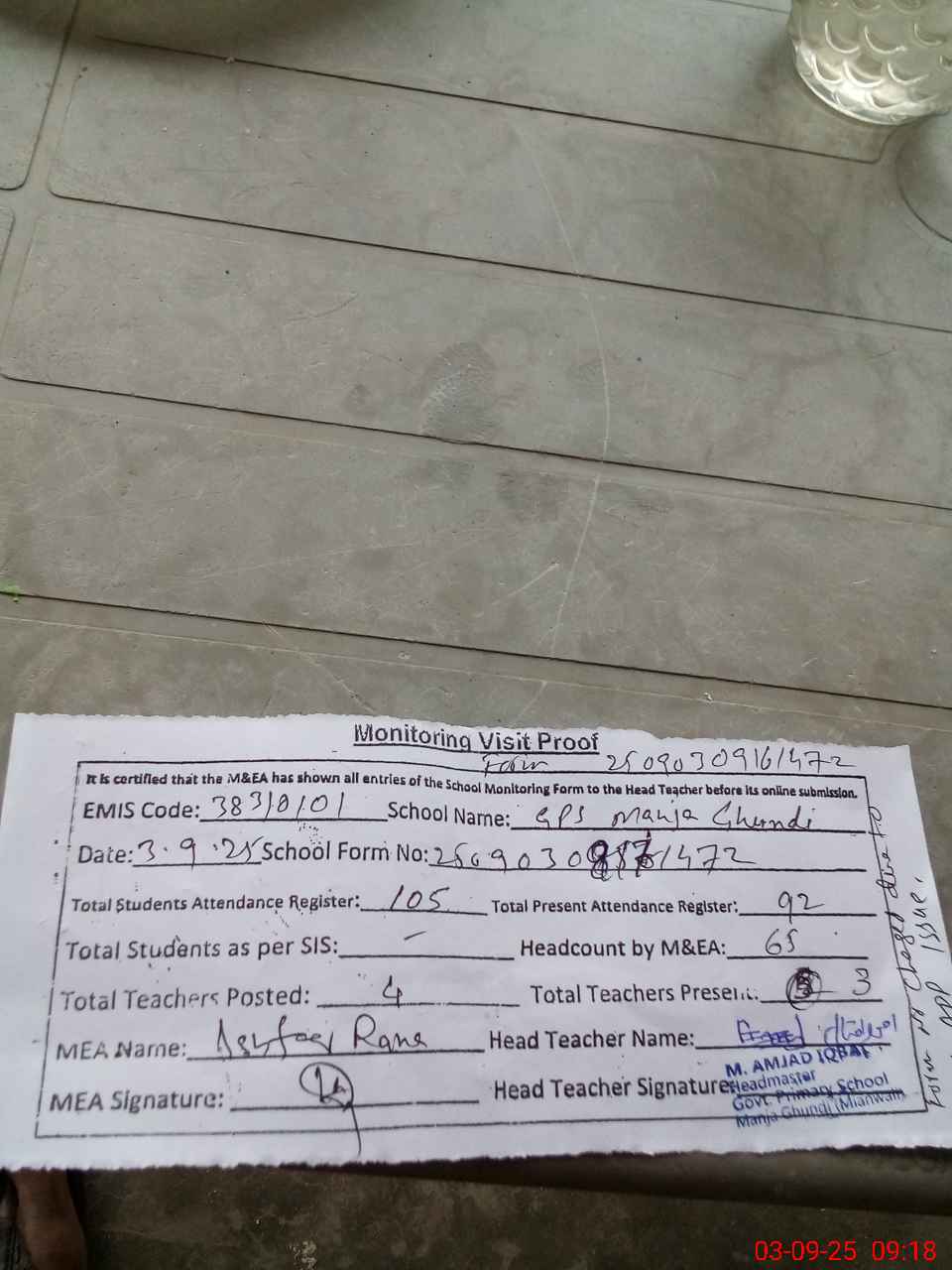 | Attendance Register | Head Teacher | MEA with School | Visit Proof |