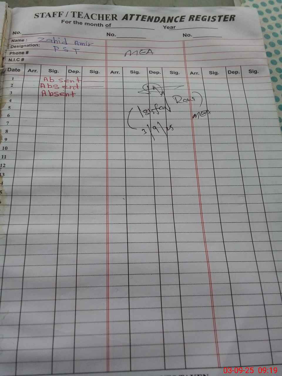 | CNIC | Full Name | Designation | R/C | Absence During Last Calender Month |