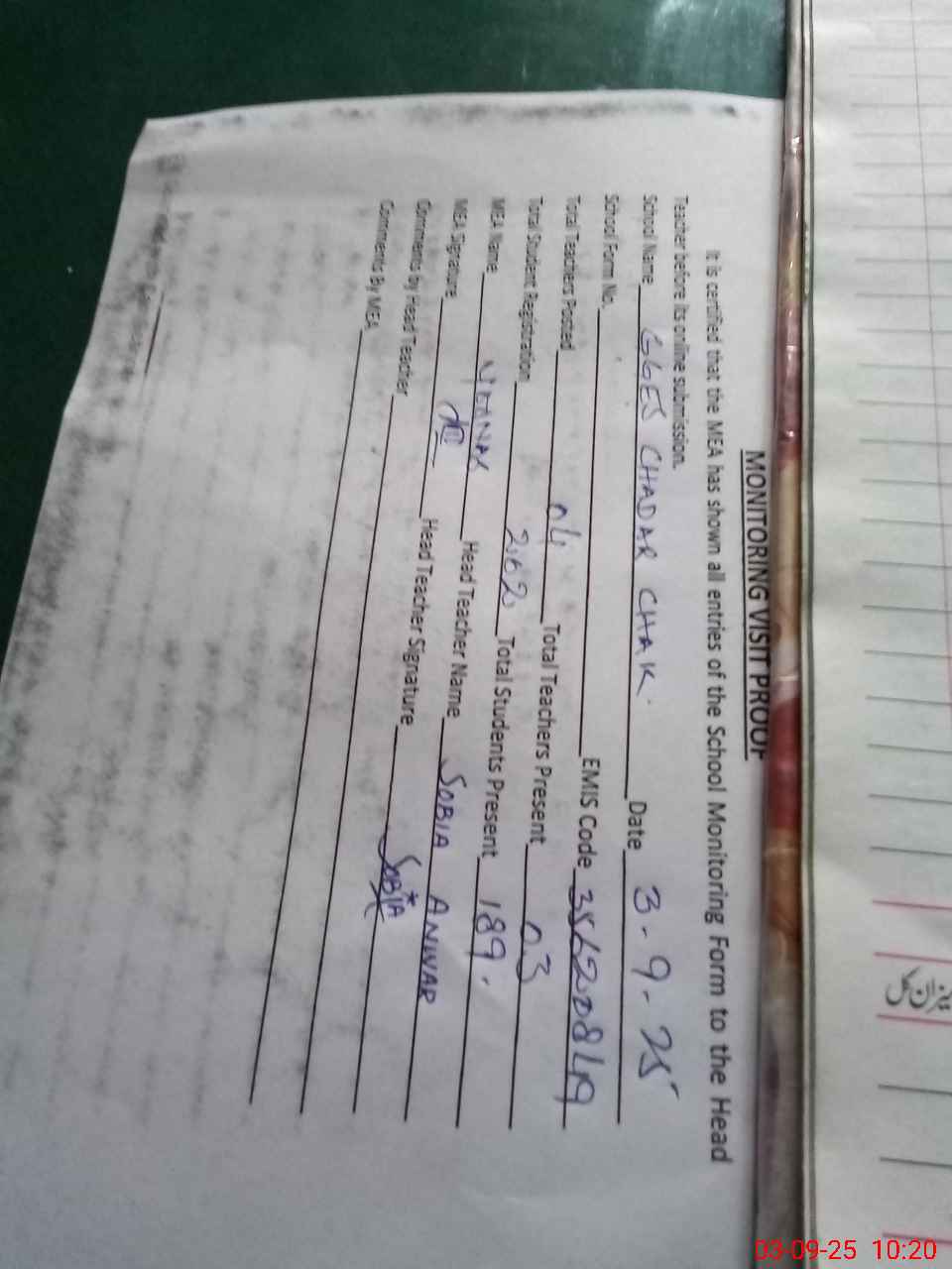 | Attendance Register | Head Teacher | MEA with School | Visit Proof |