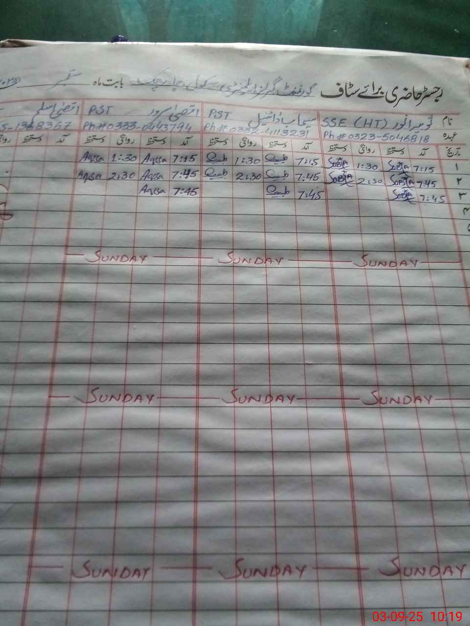 | Name: SO**** AN**** Designation: (School Headmaster's/Headmistress's) SSE ( URDU ) Phone/Cell Number: 03**** |