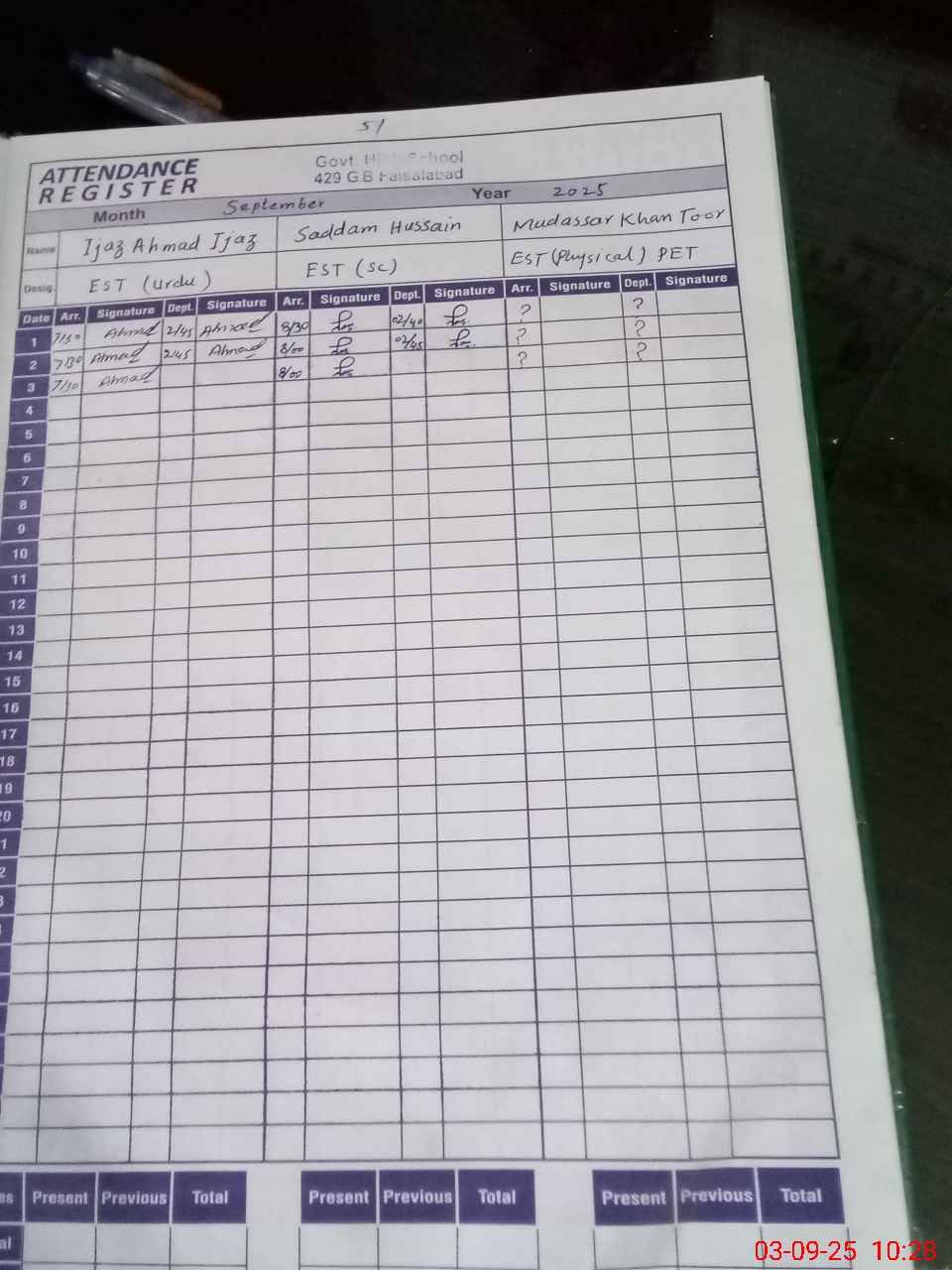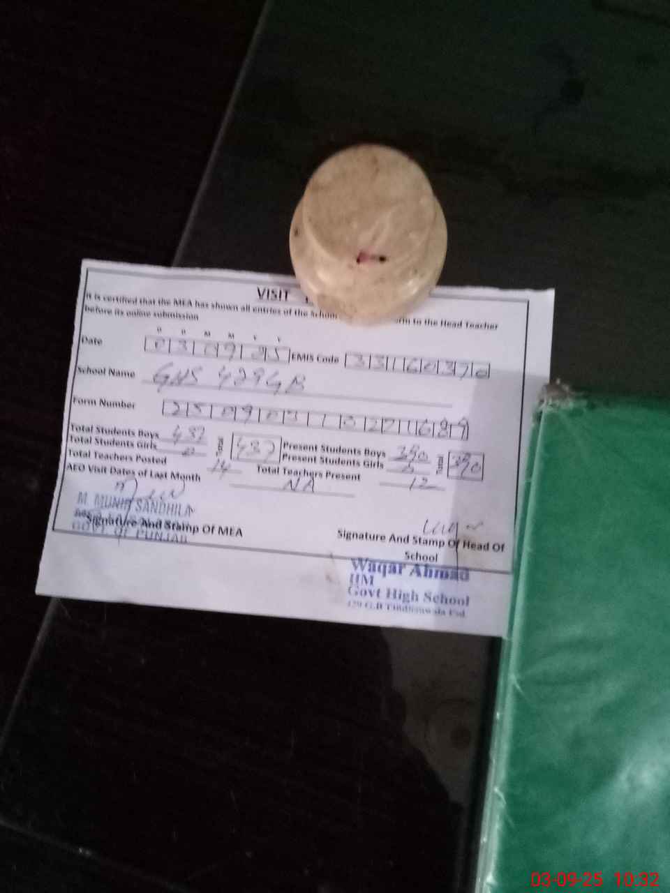 | Remarks (Use Separate Page if Required): PET Mudassir Khan Toor was absent at the time of MEA visit as per record he is absent from school from the opening of school | |||||