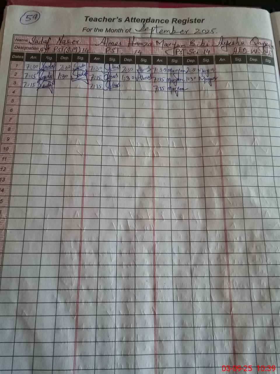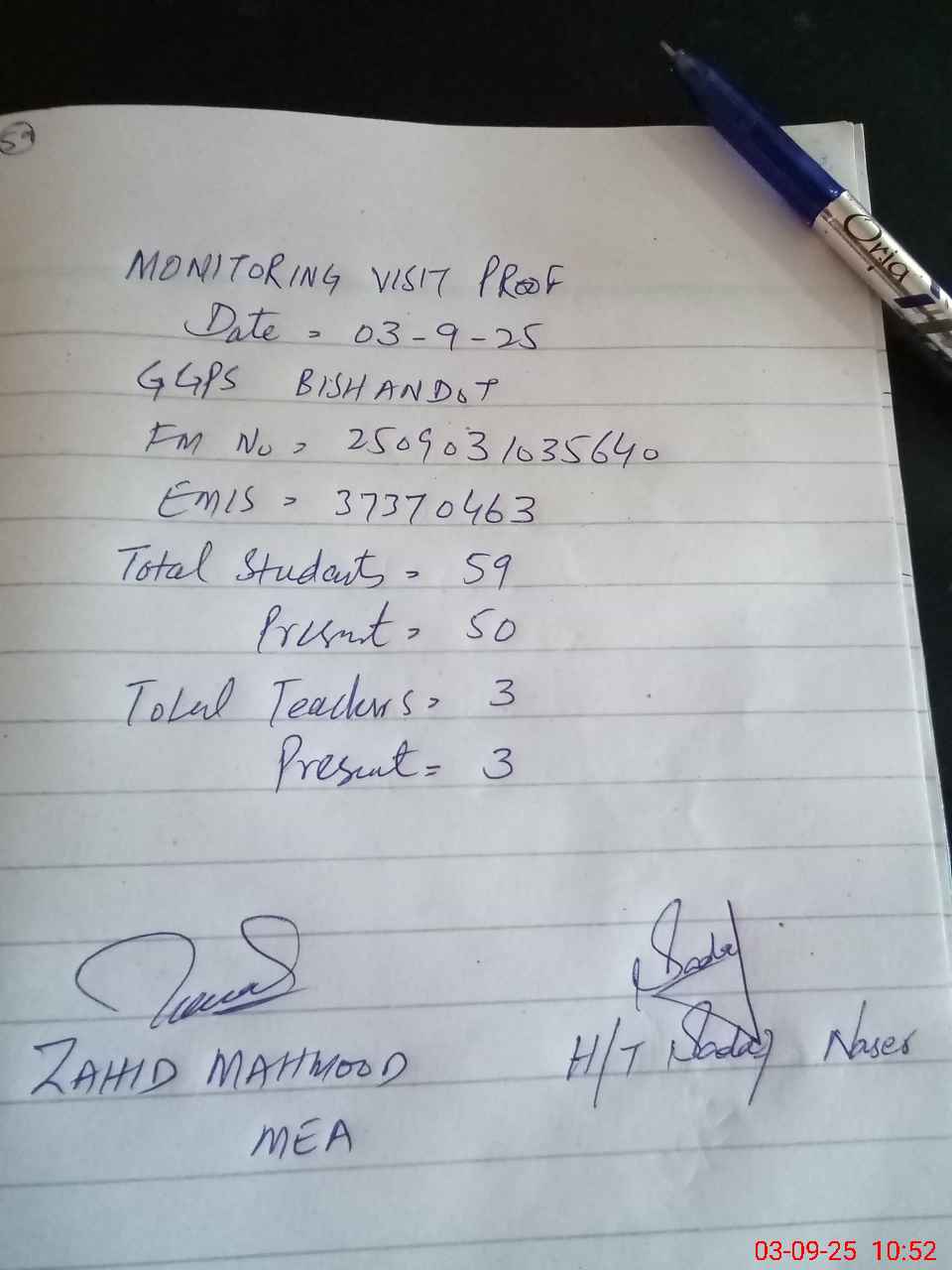 | Monitoring Date: 03-09-2025 | Start Time: 03-09-2025 10:35 AM | End Time: 03-09-2025 10:54 AM | Name of MEA: Za**** Me**** | |