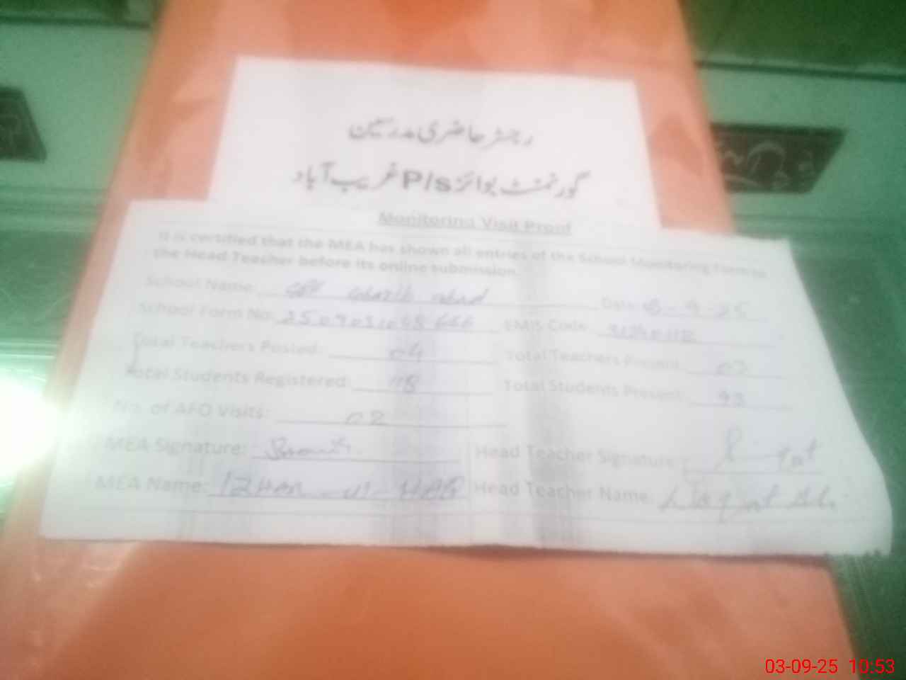 | Attendance Register | Head Teacher | MEA with School | Visit Proof |