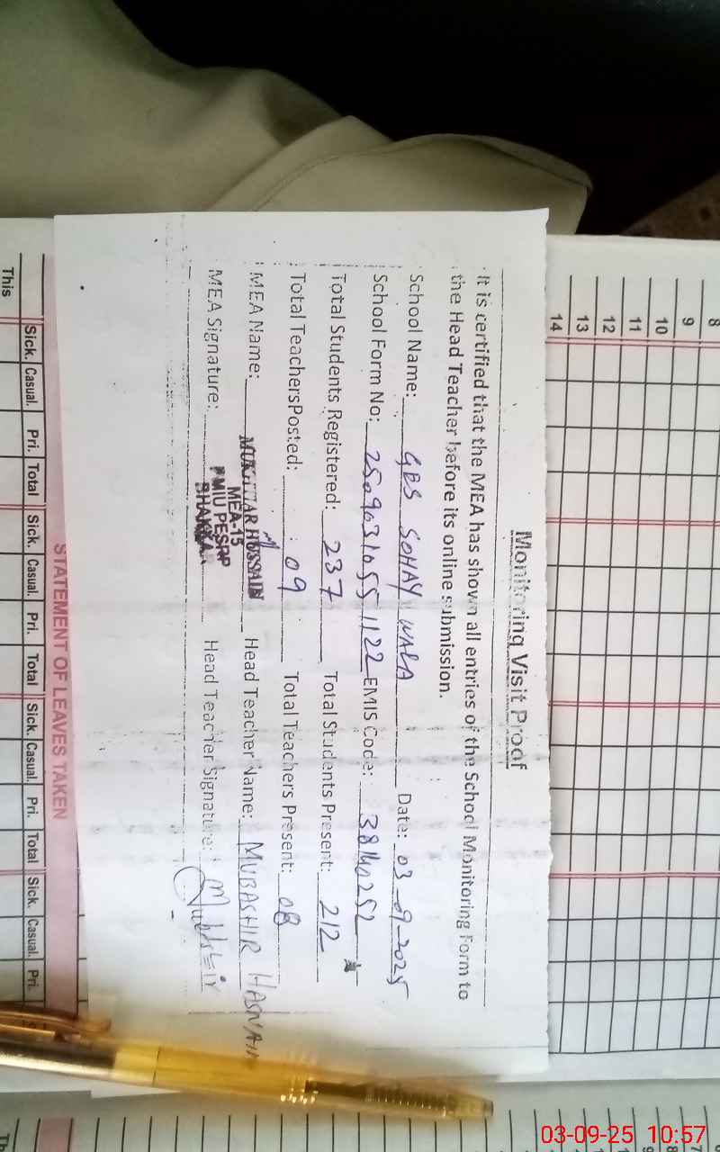 | Attendance Register | Head Teacher | MEA with School | Visit Proof |