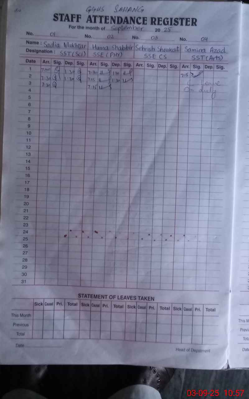 | Remarks (Use Separate Page if Required): Teacher Sehrish Shuokat sse comp verbally attached to another school by DEO sec edu since June 2025 but still no written orders received by ic Hm Hence due to absence of any sanctioned orders considered as Unauthorized ABSENT | |||||