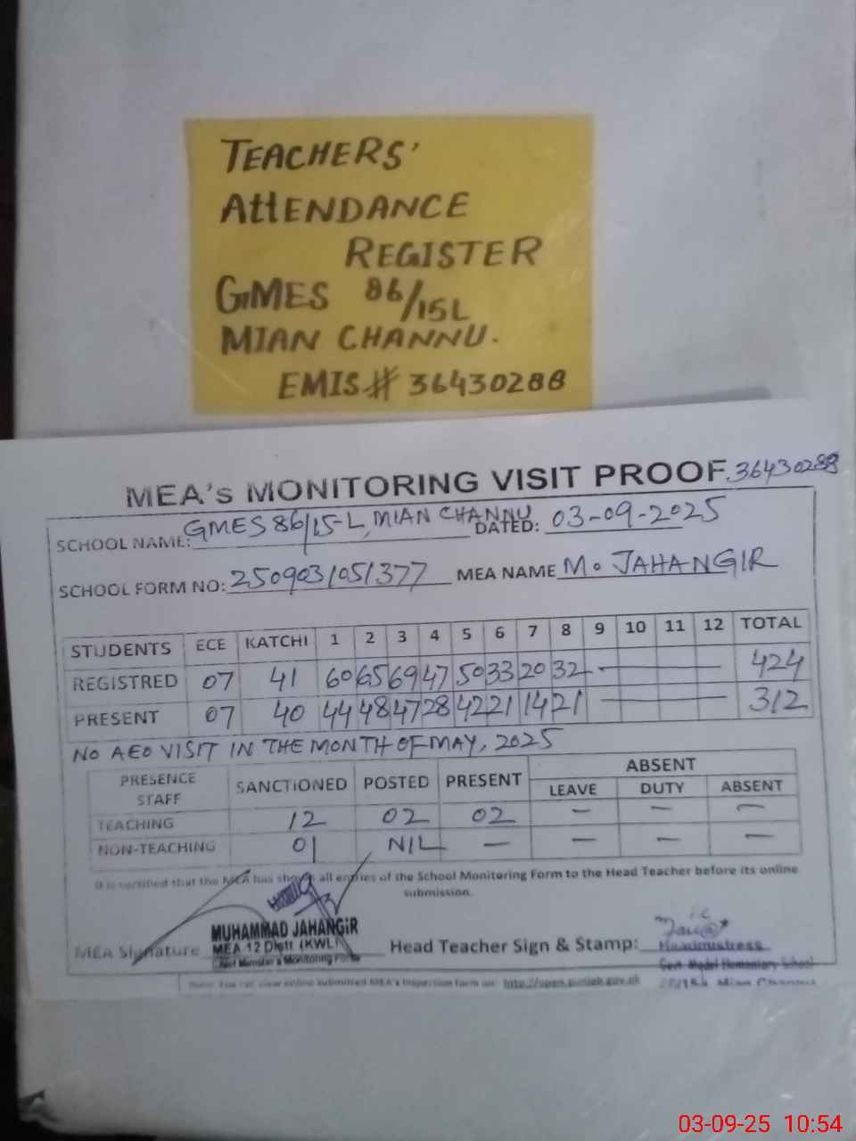 | EMIS Code: 36430288 | Name of School: GMES 86/15-L, P/O 84/15-L, MIAN CHANNU | |||