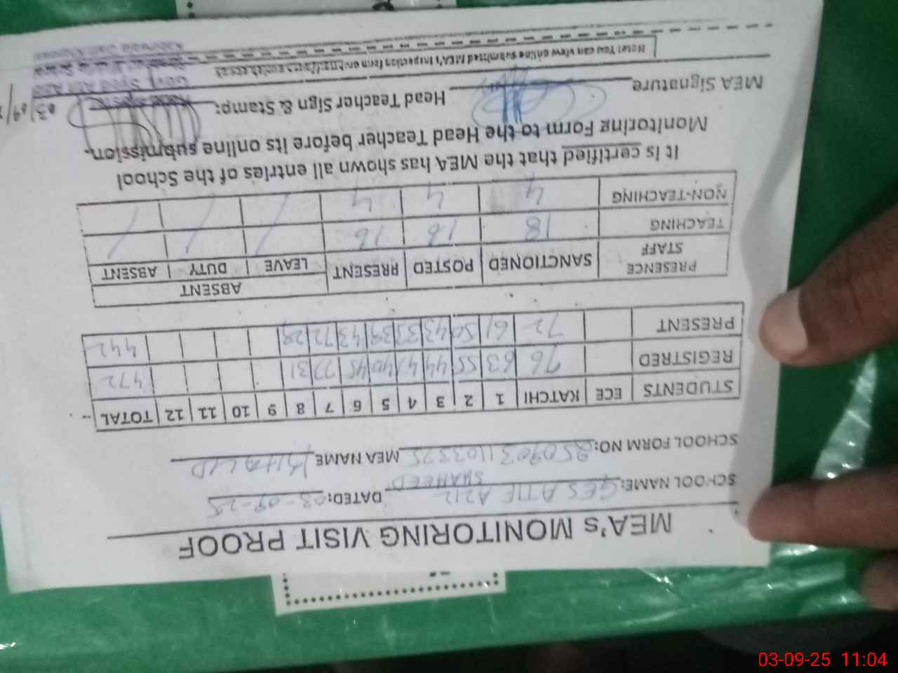 | Attendance Register | Head Teacher | MEA with School | Visit Proof |