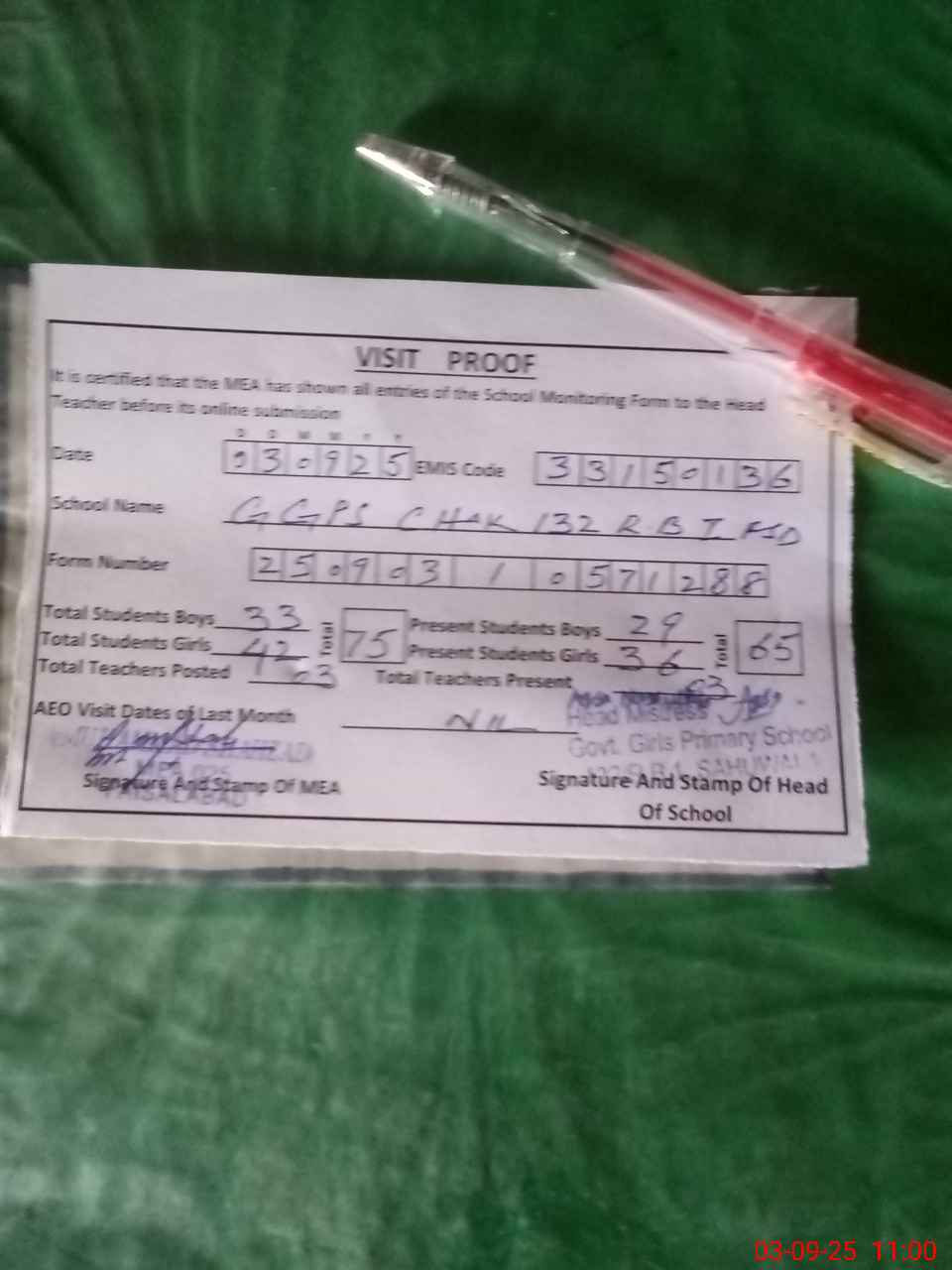 | EMIS Code: 33150136 | Name of School: GGPS CHAK NO 132 RB I | |||
