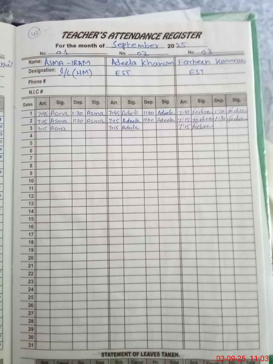 | CNIC | Full Name | Designation | R/C | Absence During Last Calender Month |