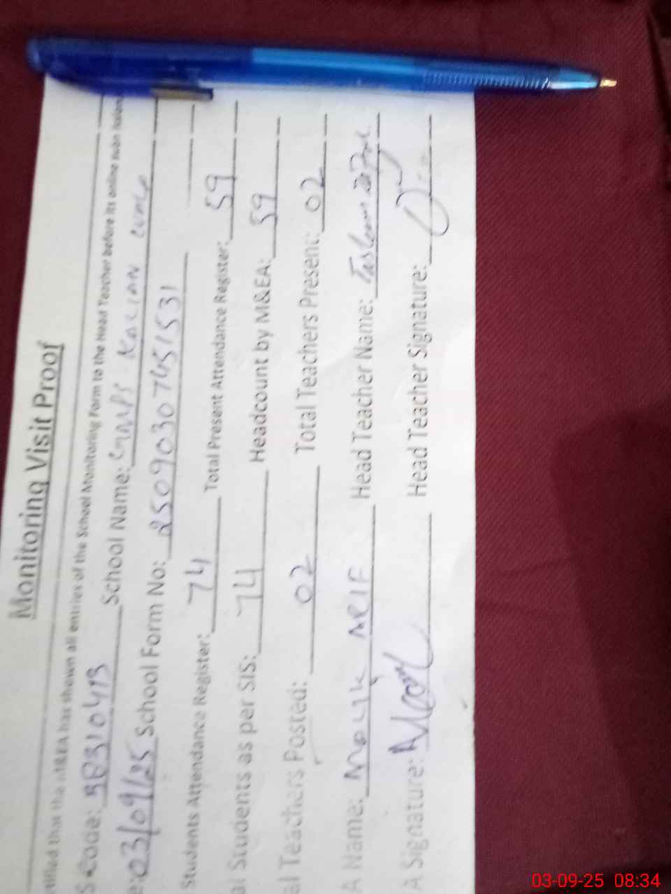| Attendance Register | Head Teacher | MEA with School | Visit Proof |