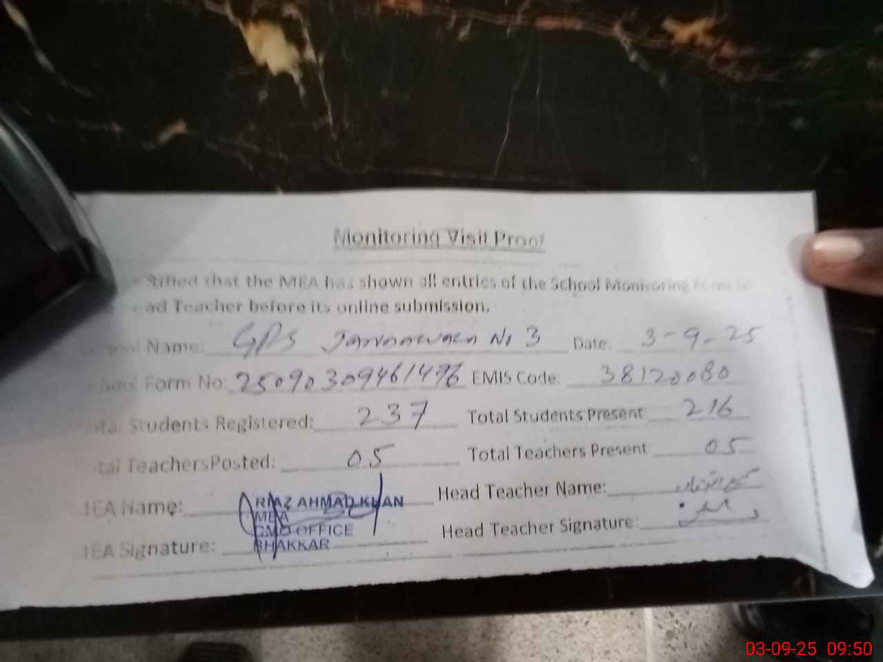 | Attendance Register | Head Teacher | MEA with School | Visit Proof |