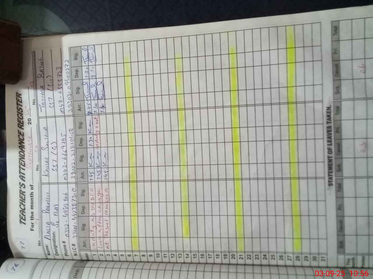 | CNIC | Full Name | Designation | R/C | Absence During Last Calender Month |
