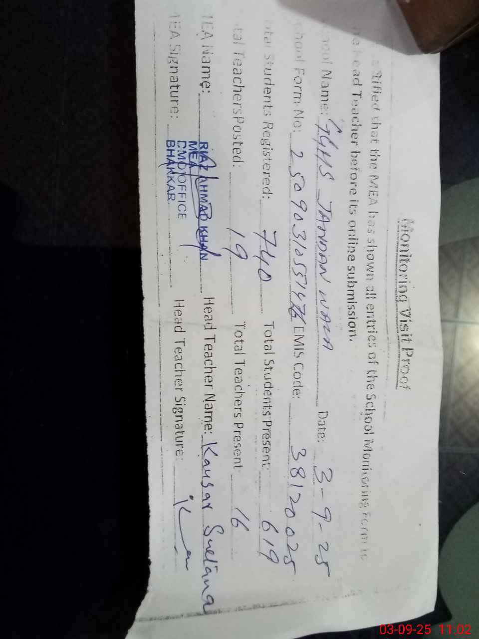 | Attendance Register | Head Teacher | MEA with School | Visit Proof |