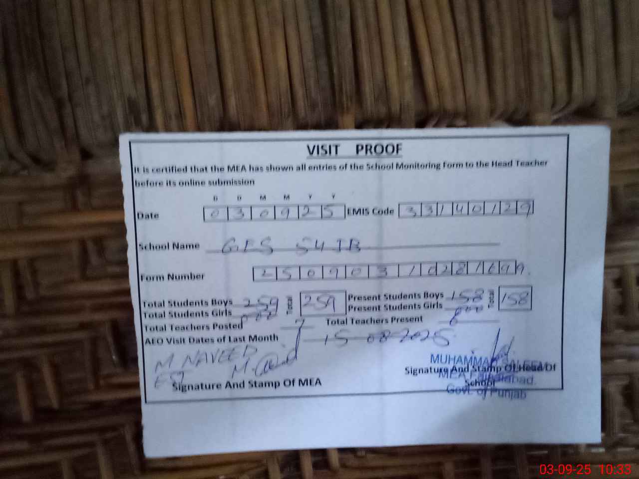 | Attendance Register | Head Teacher | MEA with School | Visit Proof |