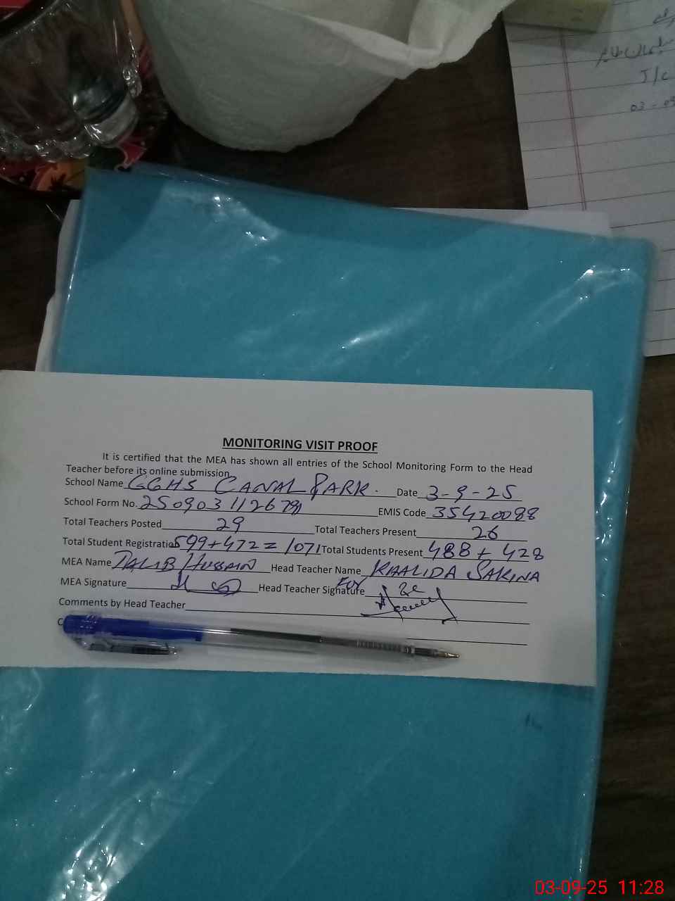 | Attendance Register | Head Teacher | MEA with School | Visit Proof |
