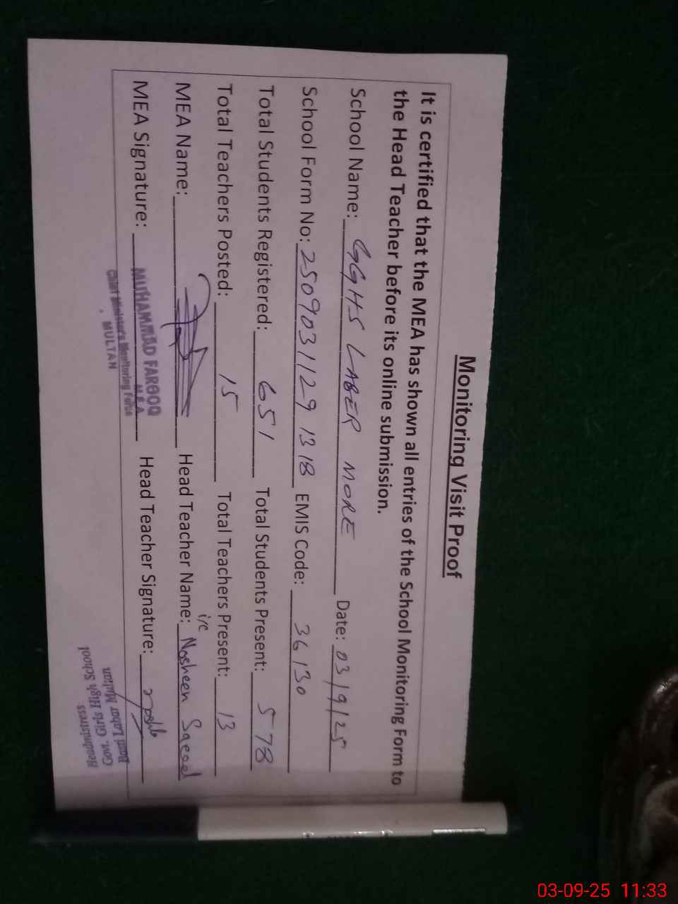 | EMIS Code: 36130112 | Name of School: GGHS LABER MORE MULTAN | |||