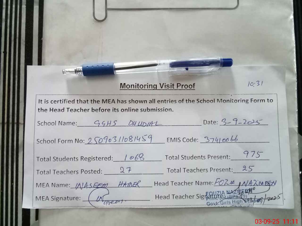 | Certified that this School was Inspected by the Undersigned MEA/DMO Today and the Information Stated Above is as Per Record. | |||||