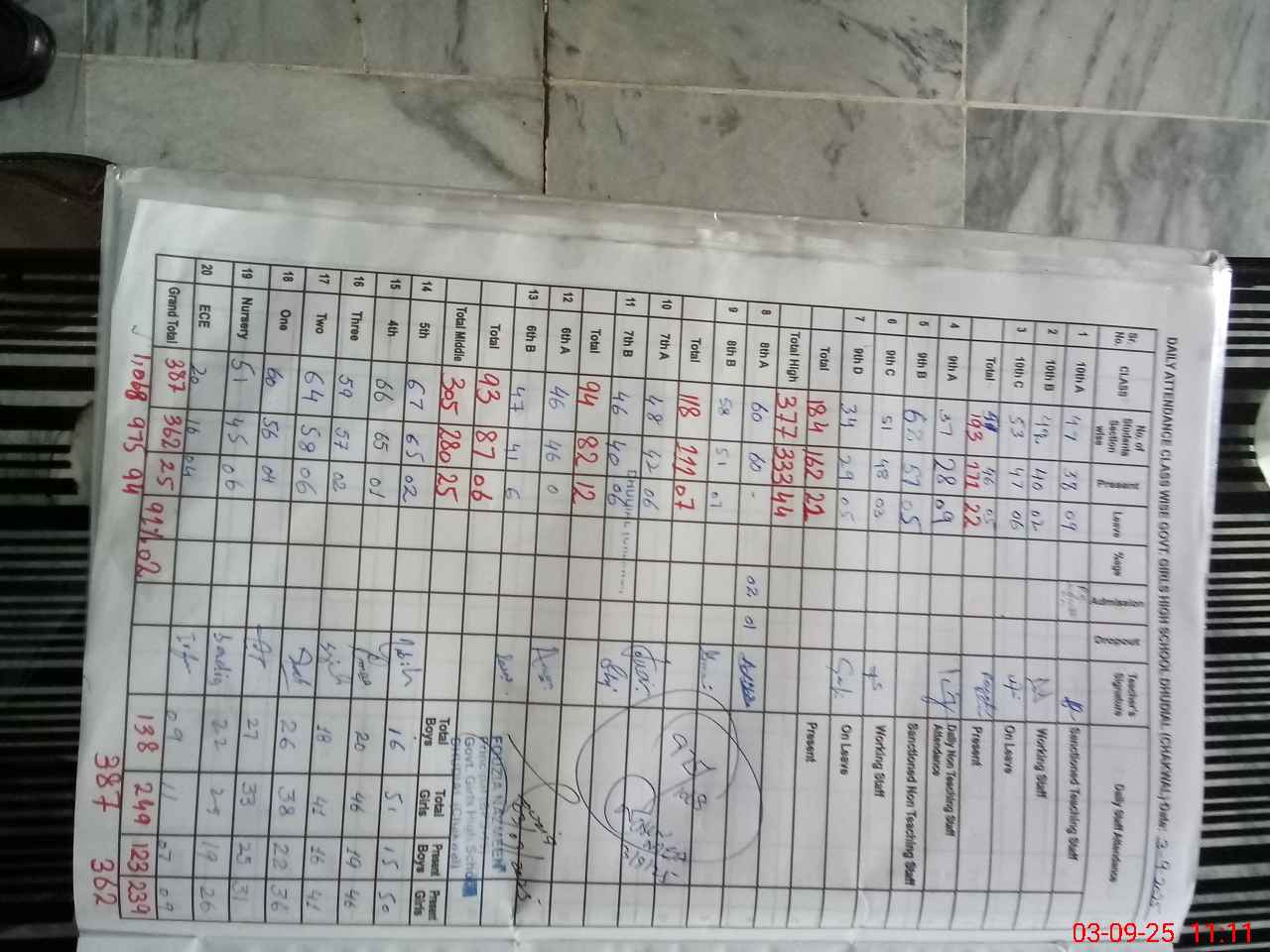 | No. of Students Present - Female | 9 | 0 | 26 | 31 | 36 | 41 | 46 | 50 | 87 | 82 | 111 | 162 | 171 | 852 | ||