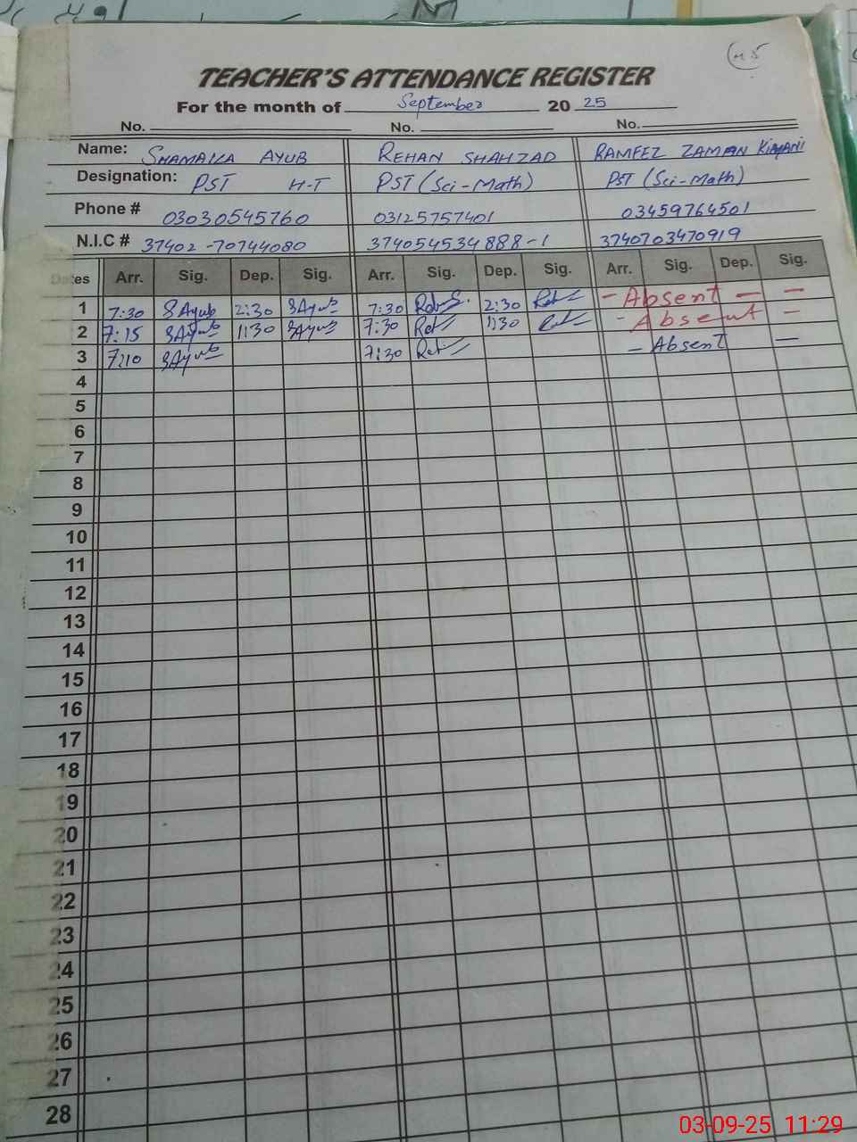 | CNIC | Full Name | Designation | R/C | Absence during last cal. month |
