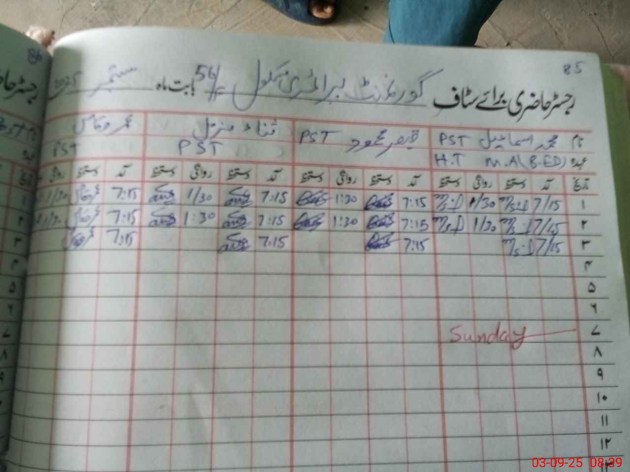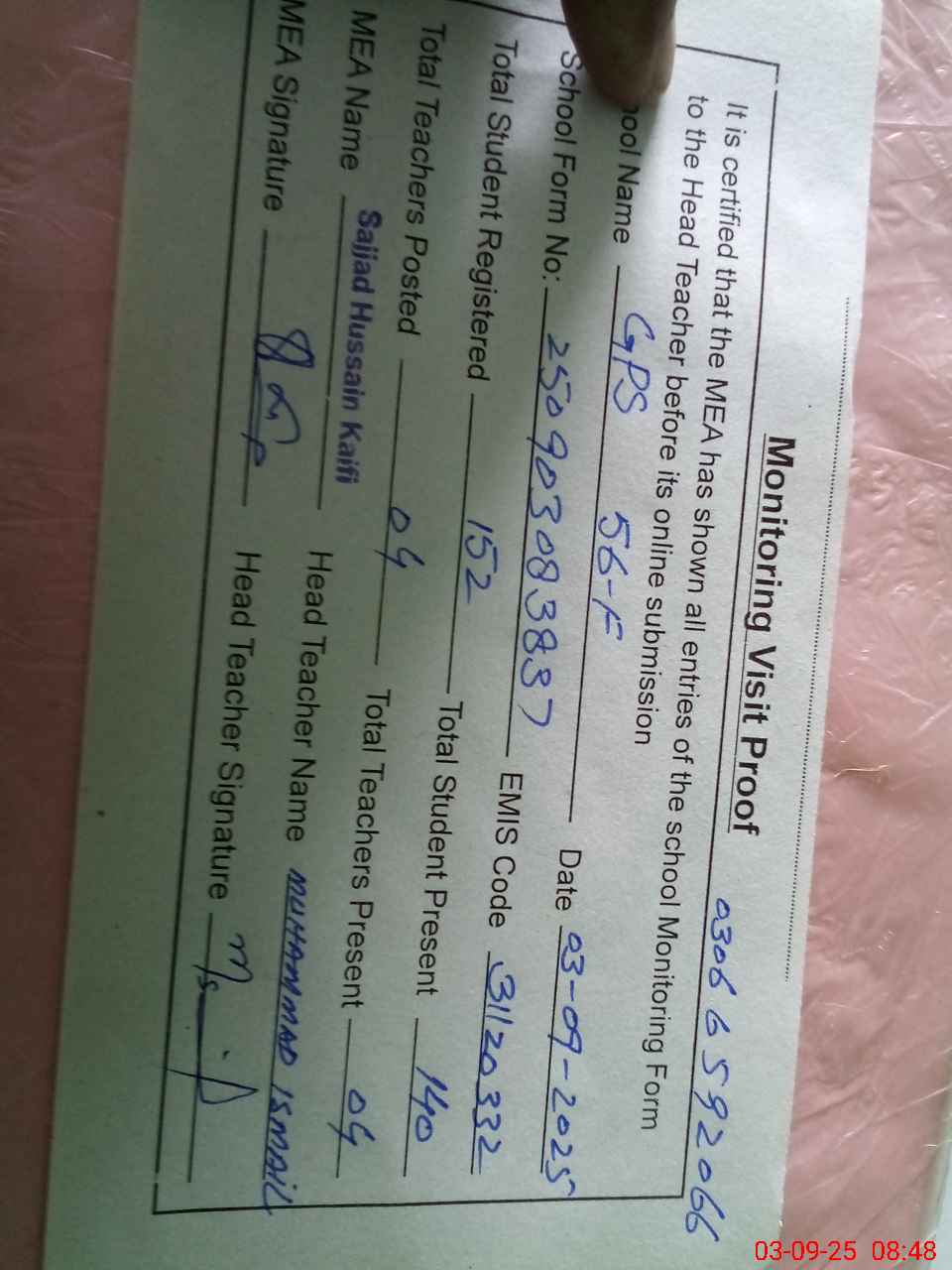 | Name: Qa**** Ma**** Designation: (School Headmaster's/Headmistress's) PST Phone/Cell Number: 03**** |