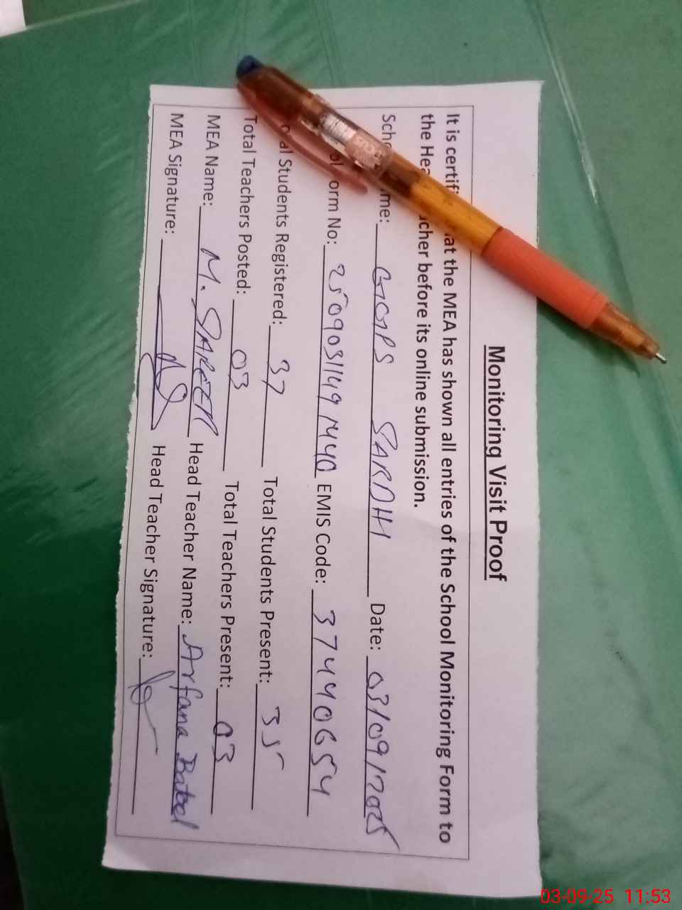 | Attendance Register | Head Teacher | MEA with School | Visit Proof |