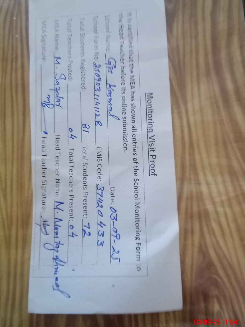 | Attendance Register | Head Teacher | MEA with School | Visit Proof |