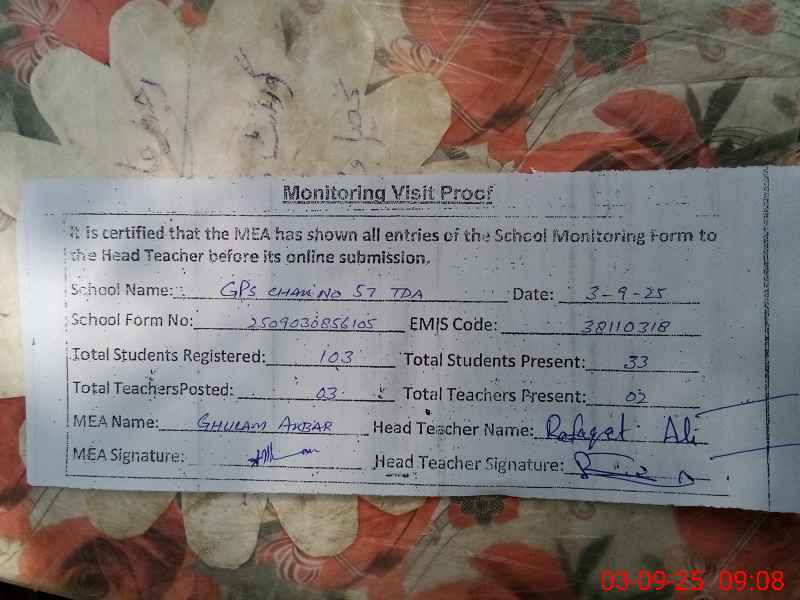 | EMIS Code: 38110318 | Name of School: GPS CHAK NO.57/TDA | |||