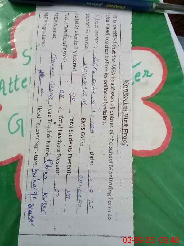 | Attendance Register | Head Teacher | MEA with School | Visit Proof |