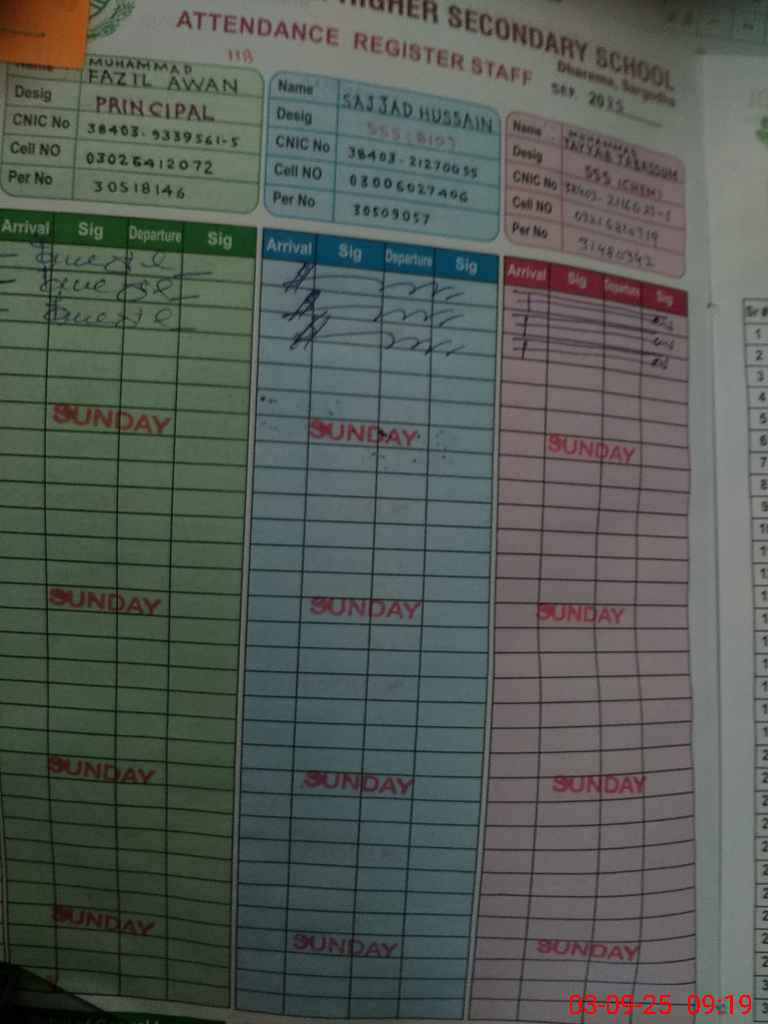 | CNIC | Full Name | Designation | R/C | Absence During Last Calender Month |
