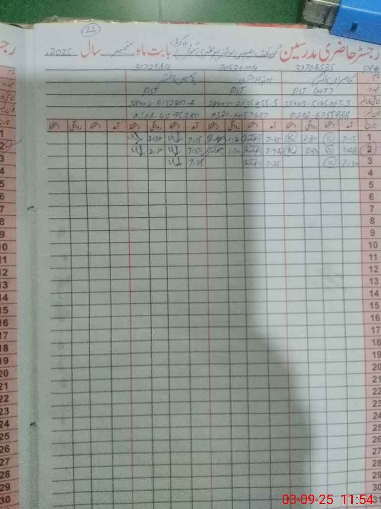| CNIC | Full Name | Designation | R/C | Absence During Last Calender Month |