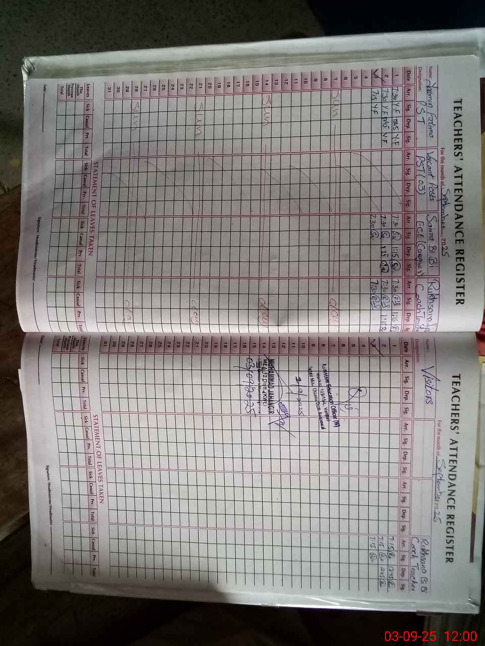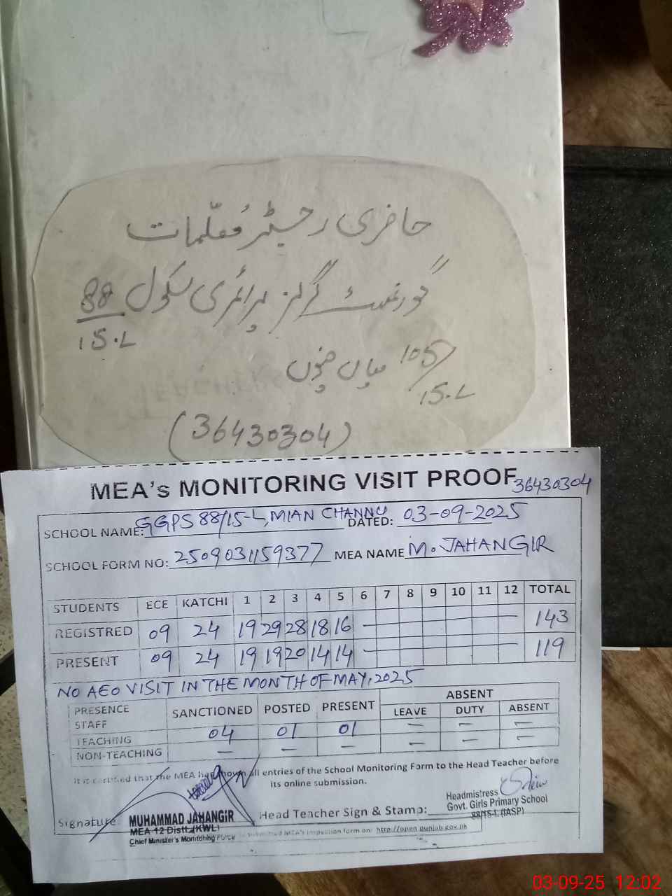 | Attendance Register | Head Teacher | MEA with School | Visit Proof |