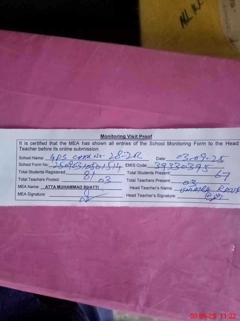 | EMIS Code: 39330395 | Name of School: GPS CHAK NO. 28/2-R | |||