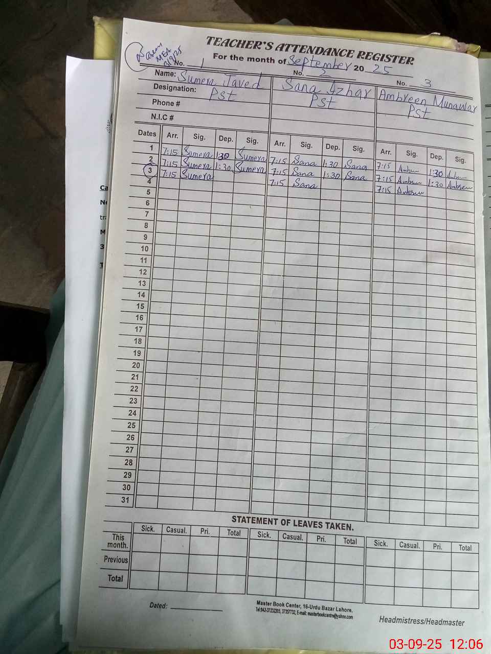 | Remarks (Use Separate Page if Required): Pst Humera batool is on duty from outsource school | |||||