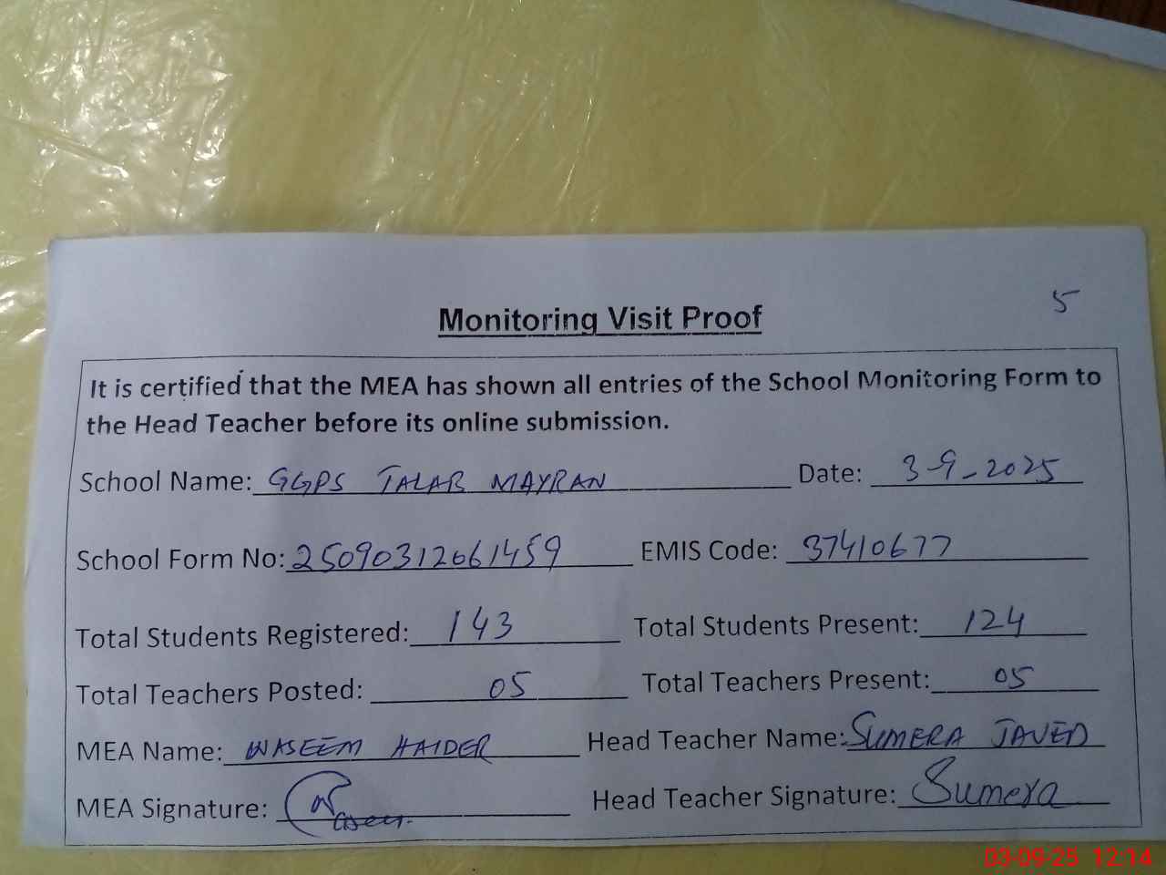 | Attendance Register | Head Teacher | MEA with School | Visit Proof |