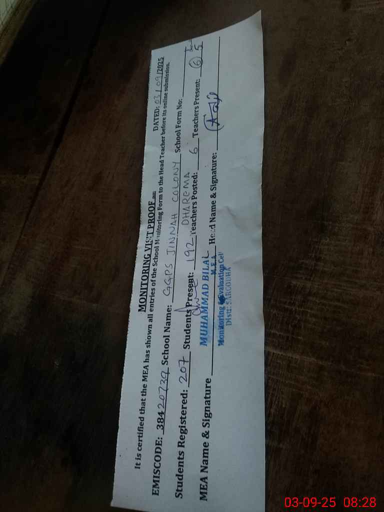 | EMIS Code: 38420739 | Name of School: GGPS JINNAH COLONY DHERAMA | |||