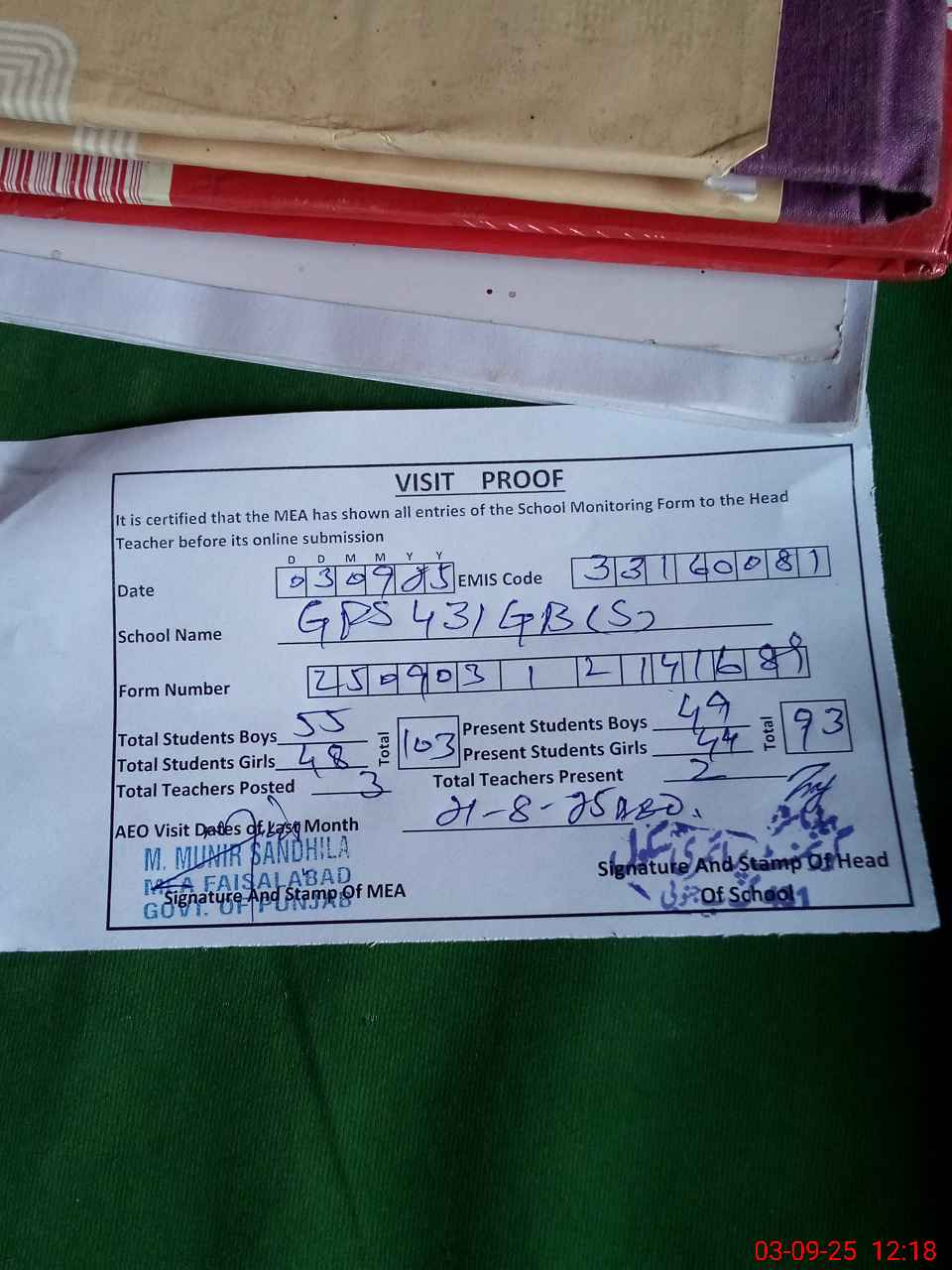 | Attendance Register | Head Teacher | MEA with School | Visit Proof |