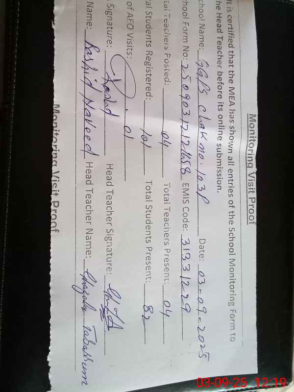 | Attendance Register | Head Teacher | MEA with School | Visit Proof |