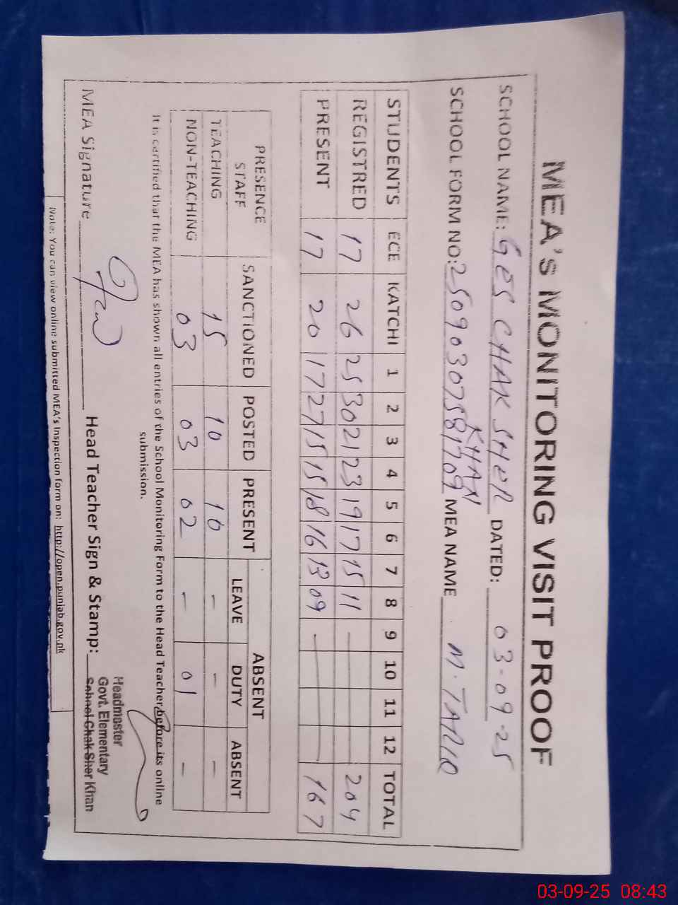 | Attendance Register | Head Teacher | MEA with School | Visit Proof |