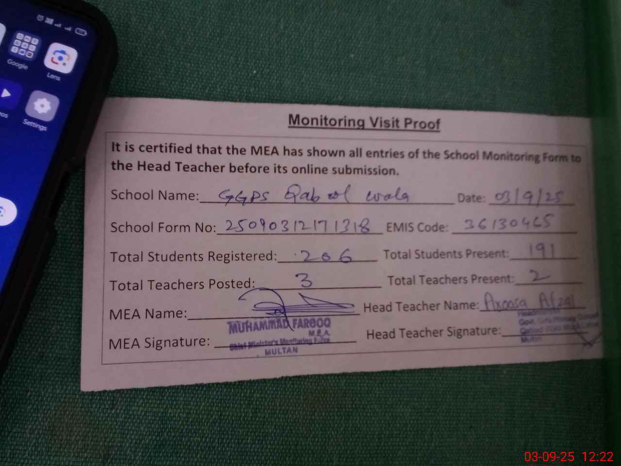 | Attendance Register | Head Teacher | MEA with School | Visit Proof |