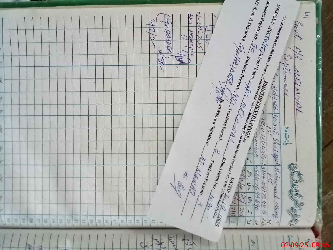 | Attendance Register | Head Teacher | MEA with School | Visit Proof |